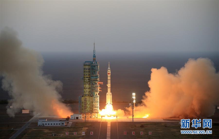 2016年10月17日7时30分,搭载着神舟十一号载人飞船的长征二号F遥十一运载火箭在酒泉卫星发射中心点火升空。 新华社记者 李刚 摄