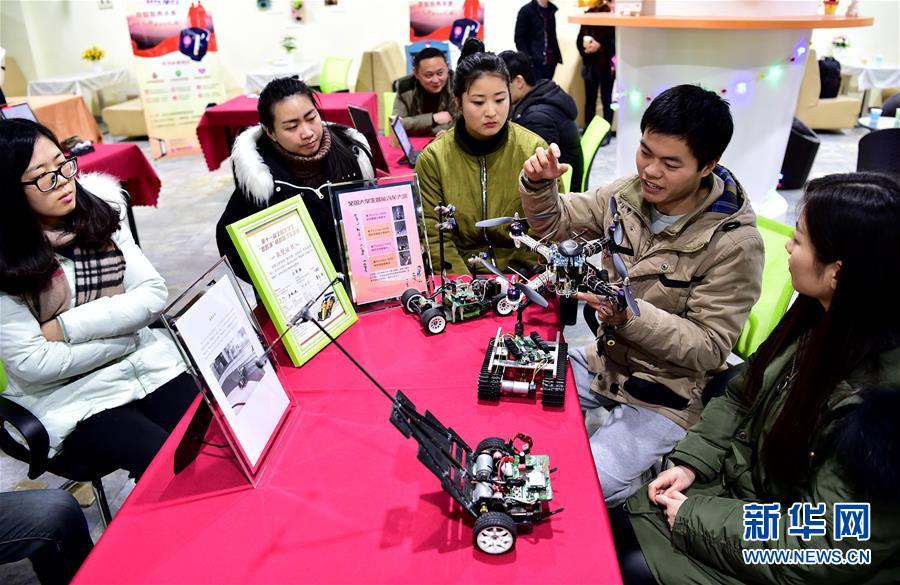 2017年1月22日,在安徽合肥市常青街道创客梦空间,青年创客向参观者介绍飞行器及智能汽车作品。 新华社记者 刘军喜 摄