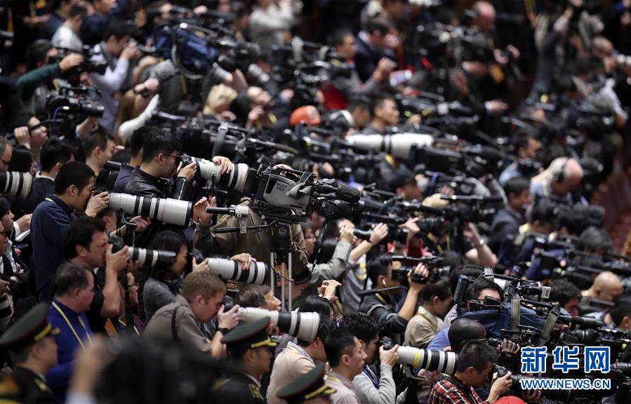 2017年10月18日,中国共产党第十九次全国代表大会在北京人民大会堂开幕。这是中外记者现场采访。 新华社记者 丁林 摄