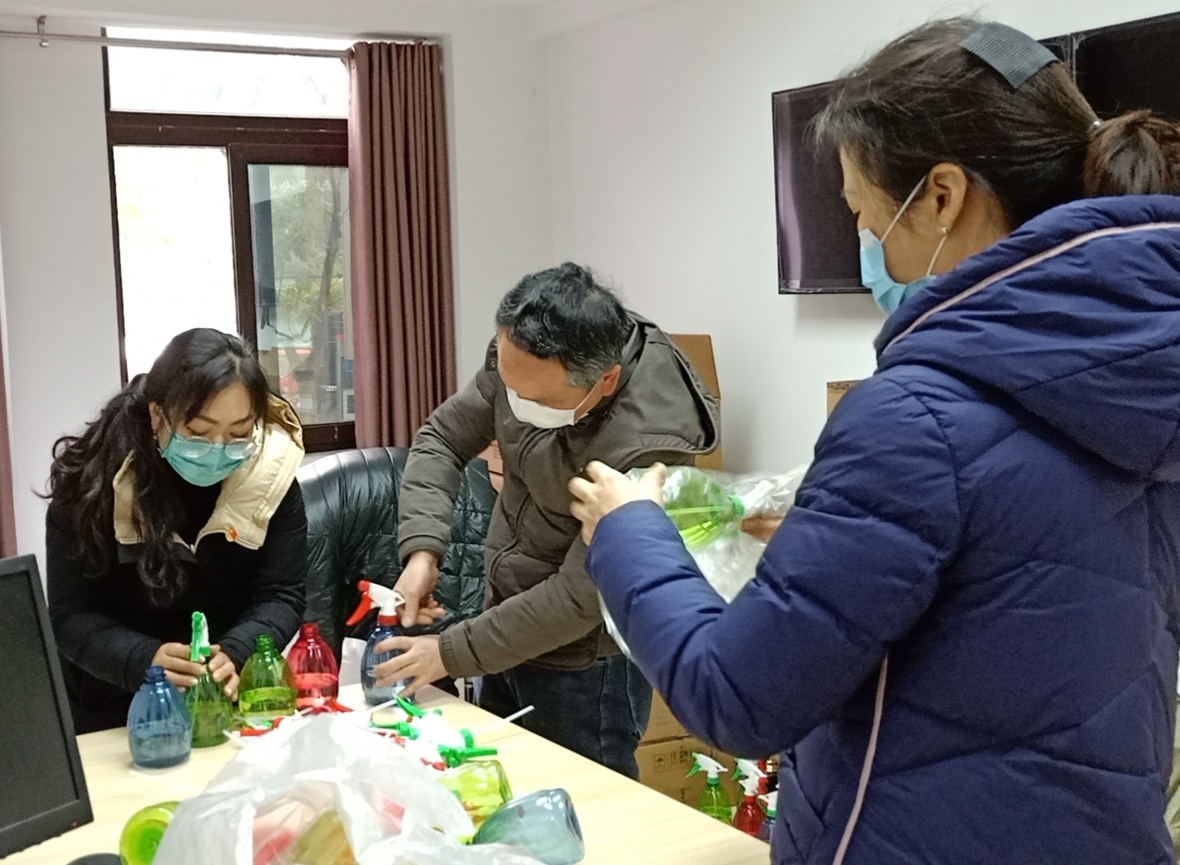镇人大代表李妍、谢洪波等分装消毒液