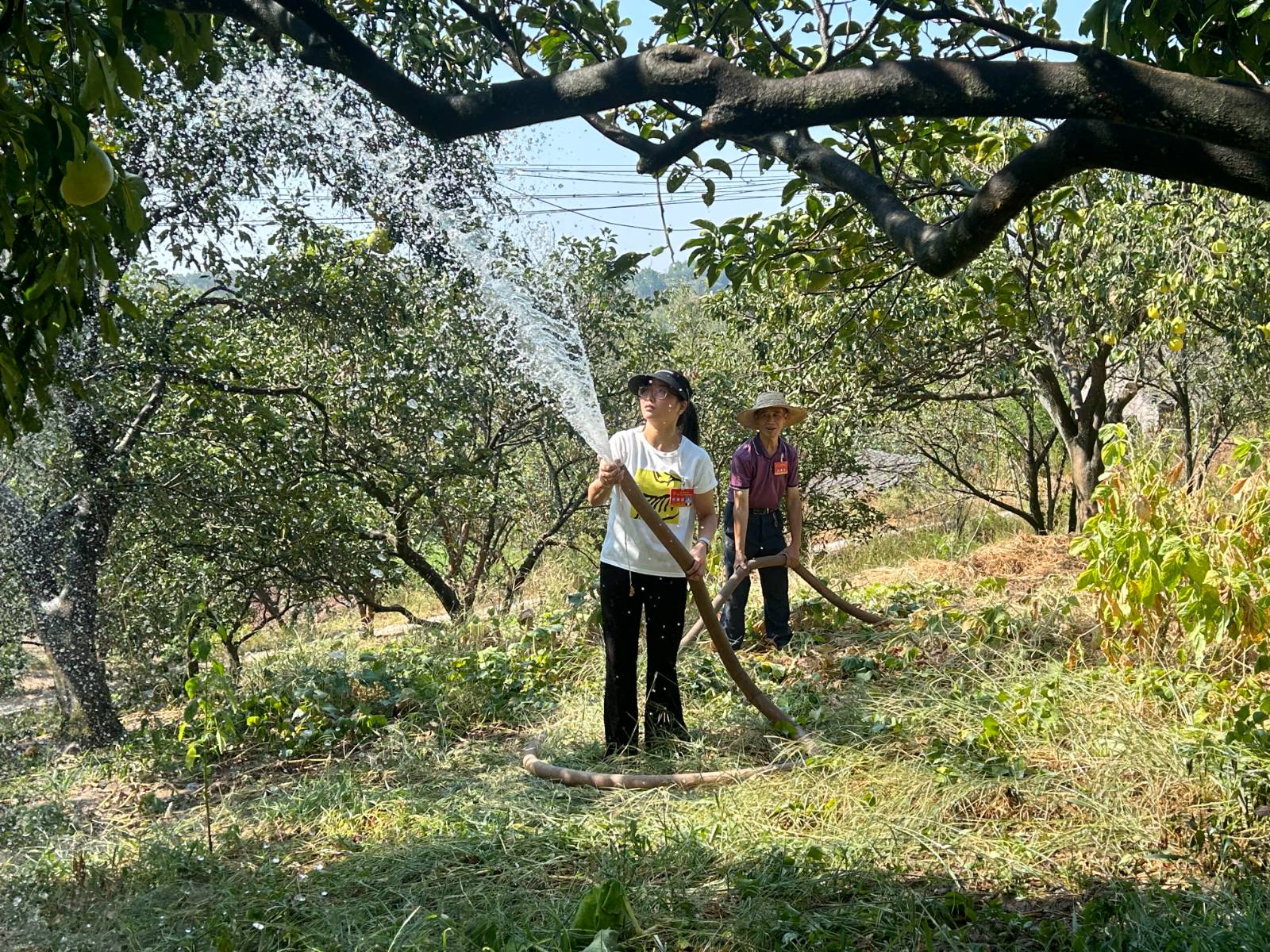 在黄沙镇永进社区,镇人大代表们正在白柚果园忙碌着,他们有的高高举起拿着水管给白柚树浇水,有的挥舞着锄头在果树周围挖着,帮助果树松土,防止过多水分流失。