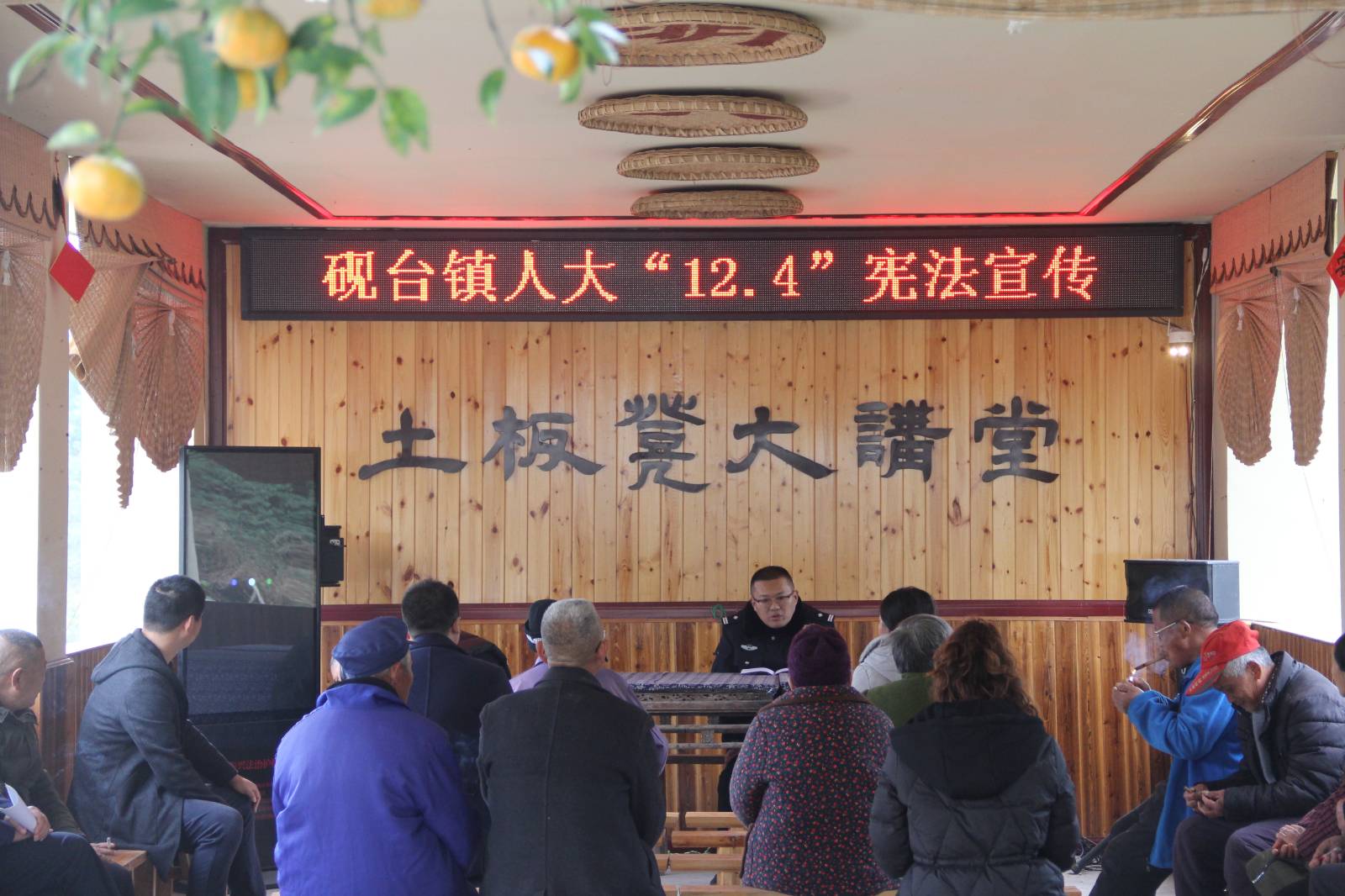 县十八届人大代表、砚台派出所所长朱柏汶在农光村农家小院“土板凳大讲堂”进行宪法宣传。